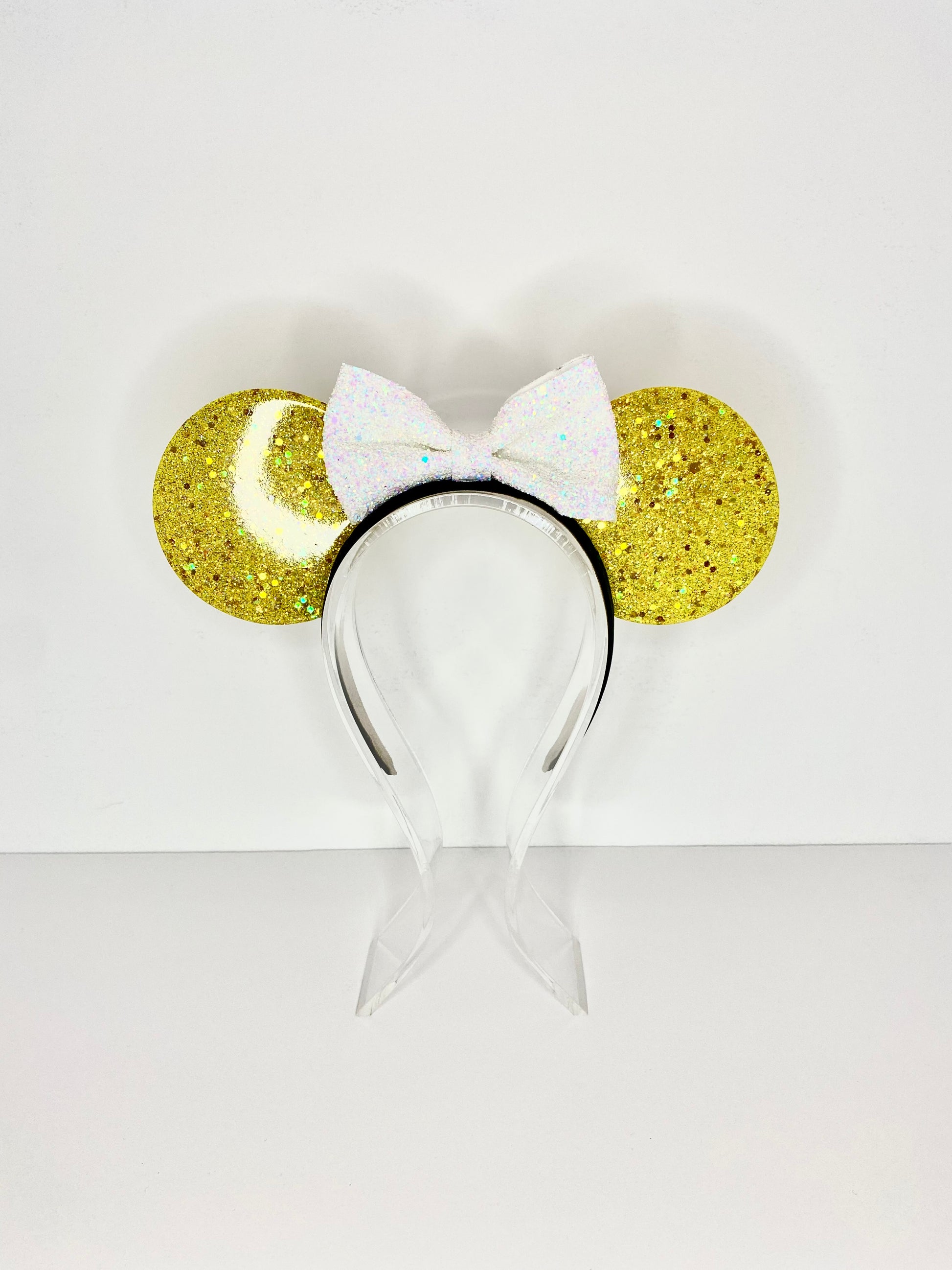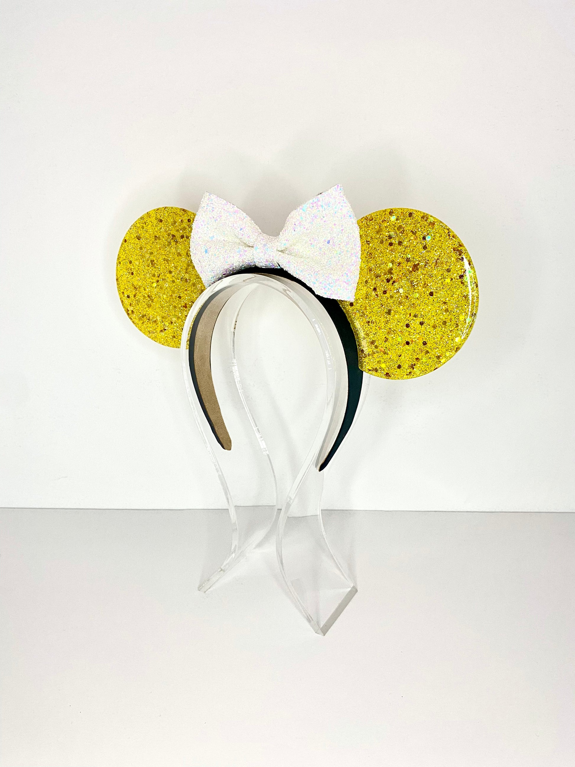 A true sunshine yellow pair of resin ears for your Belle or Pooh Bear bounds, with our classic white glitter bow to make your park day bright!